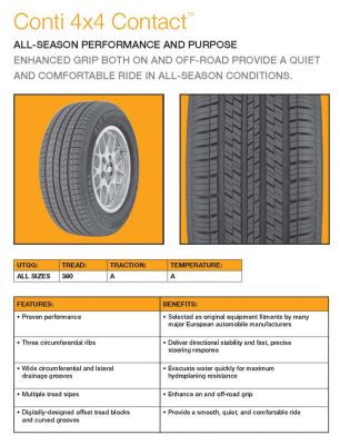 Описание, цены, характеристики шины CONTINENTAL Conti4X4Contact. Список размеров CONTINENTAL Conti4X4Contact. Вы также можете купить шины CONTINENTAL Conti4X4Contact в Щелкино с доставкой по Крыму. Цены на CONTINENTAL Conti4X4Contact указаны за одну единицу товара. Просим обратить ваше внимание на то, что купить автошины CONTINENTAL Conti4X4Contact можно как за наличный, так и безналичный расчет с бесплатной доставкой по г. Щелкино*.